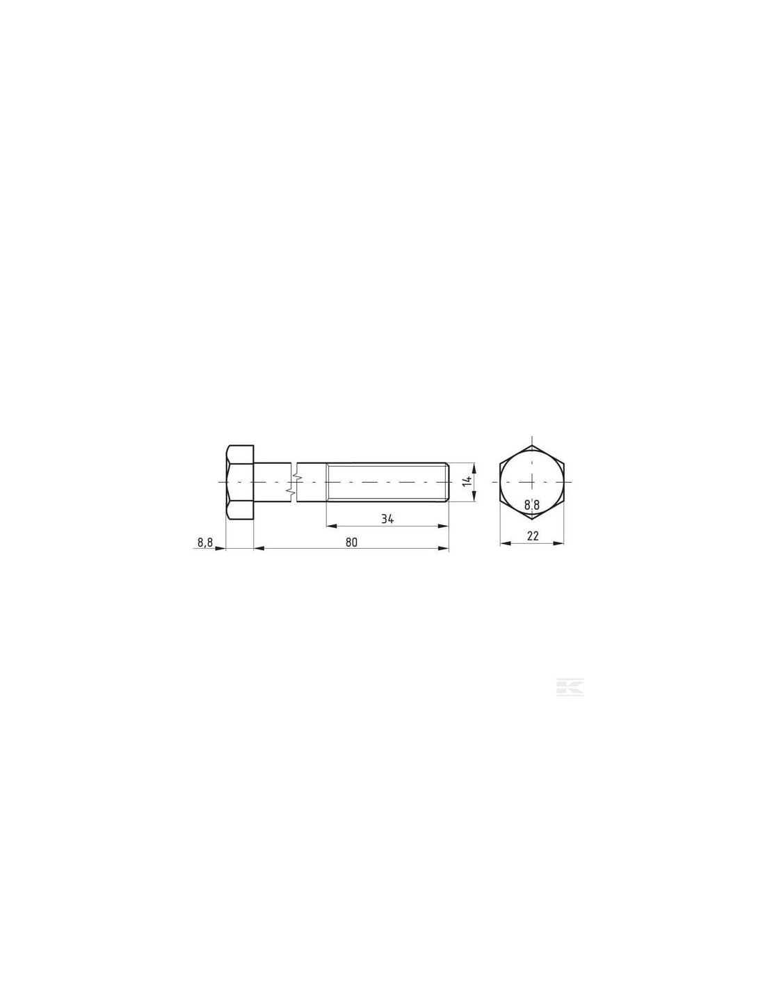 Numer części: 02101408088 EAN: 5700037522821 Jednostka: Kilogram Ilość (zaokrąglenie): 5 Opis produktu: Śruba pół gwint z łbem sześciokątnym, długość mierzona od spodu łba. Rodzaj wymiarowania: Metryczny dŚrednica gwintu: M14 Skok gwintu: 2.00 mm Długość: 80 mm bDługość gwintu: 34 mm Kształt łba: 6-kt. na klucz Typ gwintu: Metryczny SRozmiar klucza: 22.0 mm KWysokość łba: 9 mm Twardość: 8.8 Obróbka powierzchni: Oksydowana Materiał: Stal Norma DIN: 931 Norma ISO: 4014