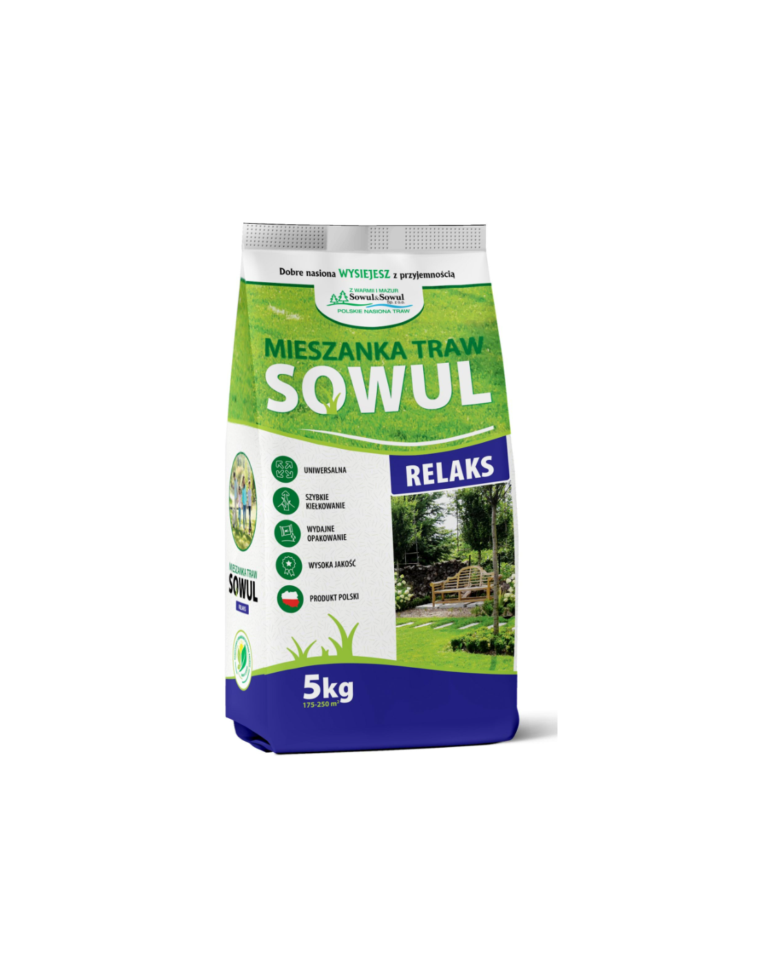 Trawa Relaks to specjalistyczna mieszanka traw, stworzona z myślą o terenach rekreacyjnych, ogrodach oraz przestrzeniach, gdzie komfort i estetyka są na pierwszym miejscu. Charakteryzuje się gęstą, soczystą zielenią, która nadaje przestrzeni elegancki wygląd, jednocześnie zapewniając wyjątkową wytrzymałość na różne warunki pogodowe. Jest odporną na uszkodzenia mechaniczne mieszanką, co sprawia, że doskonale nadaje się do intensywnie użytkowanych przestrzeni, takich jak trawniki ogrodowe, tereny do wypoczynku czy przestrzenie relaksacyjne.
